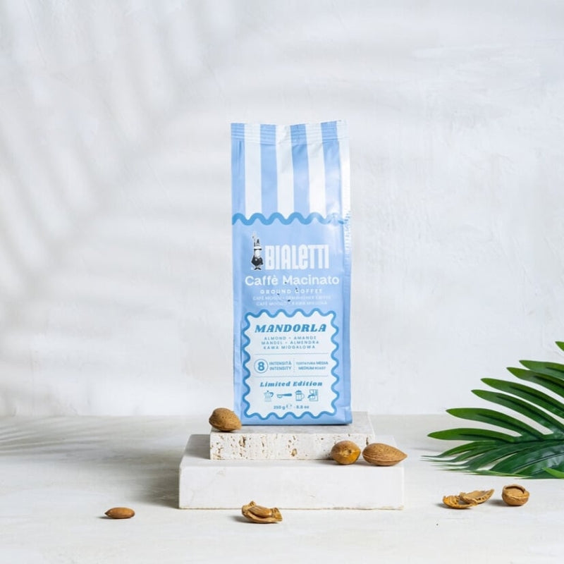 Discover the delightful harmony of Italian brewing with the Bialetti Caffè Macinato Mandorla Gift Set - 3 Cup Moka Express Blue with 250g Almond Coffee, a curated collection featuring a soft light blue 3-cup Moka Express and 250g of infused coffee with natural almond flavour. Crafted in Italy from 80% Arabica and 20% Robusta beans, this set delivers a rich, full-bodied espresso with a smooth, subtly sweet almond twist. Perfect for coffee lovers seeking a unique, aromatic experience, it's an ideal gift for holidays or special occasions, and the coffee works well for iced drinks too.