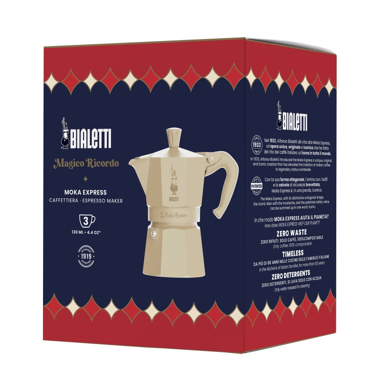 Bring warmth and nostalgia to your mornings with the Bialetti Magico Ricordo Moka Express 3 Cup Cream - Limited Edition Stovetop Espresso Maker, a charming design with a soft cream powder-coated finish and vintage Christmas holiday motifs. Ideal for coffee lovers and collectors, it's a subtle holiday-inspired piece that delivers authentic flavour in a gentle, elegant package.