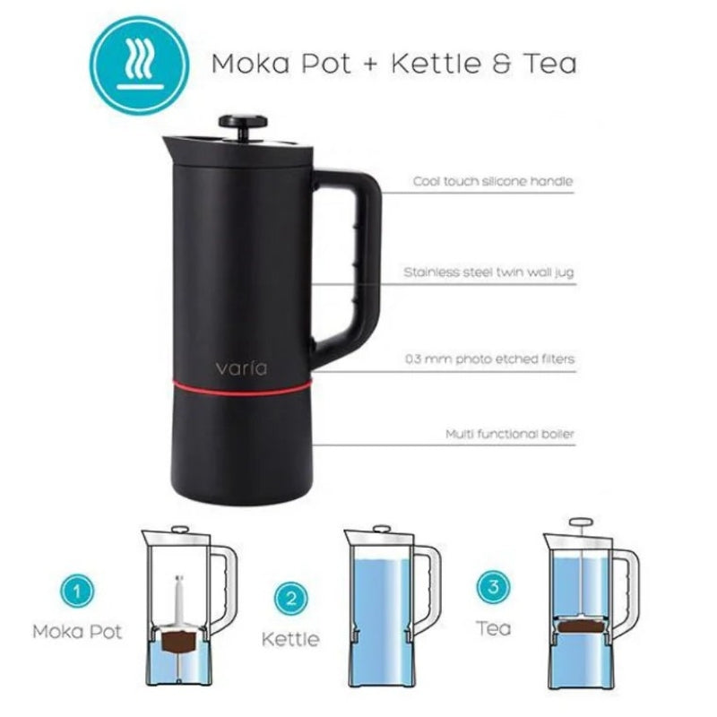 Revolutionize your home brewing with the Varia Multi Brewer, the ultimate 6-in-1 coffee maker designed by coffee experts in New Zealand. This modular, all-in-one system combines French press, stovetop moka pot, pour-over dripper, cold brew, kettle, and teapot functions into one sleek, high-quality stainless steel unit. Crafted with durable double-walled stainless steel and a cool-touch silicone handle, it delivers exceptional coffee or tea whichever way you prefer – from bold Italian-style espresso to smooth cold brew or classic filter coffee.